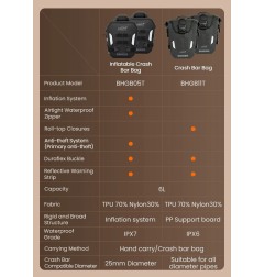 La coppia di borse gonfiabili per barre paramotore LOBOO è pensata per chi cerca “protezione barre paramotore moto” e “borse gonfiabili crash bar” per viaggi a lungo raggio e utilizzo off-road. Il kit include due borse indipendenti, ciascuna dotata di camera gonfiabile che, una volta pressurizzata, genera una struttura rigida ad ampia superficie. In caso di caduta o ribaltamento, le borse forniscono una protezione passiva con carico non inferiore a 300 kg, contribuendo a proteggere motore, telaio e pilota. Il materiale in TPU impermeabile con base in nylon e la chiusura roll-top a doppia fibbia limitano l’ingresso di acqua e sporco. La piastra interna in PP garantisce stabilità strutturale anche a borsa vuota. Compatibilità universale con tubi paramotore di qualsiasi diametro, con inserti riflettenti per migliorare la visibilità notturna.