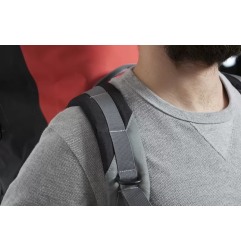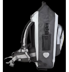 Lo schienale imbottito in tessuto reticolare traspirante garantisce comfort anche durante lunghi tragitti, mentre il sistema di chiusura Quick PROOF, superiore o laterale, consente di regolare rapidamente la capacità e il grado di impermeabilità.