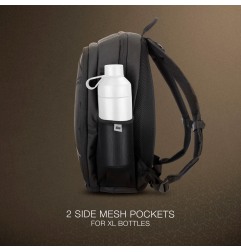 R: Due tasche con zip, due laterali elasticizzate, tasca interna con zip, tasca interna aperta e rete organizer.