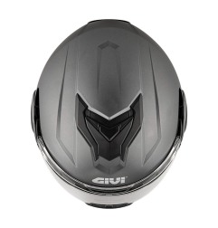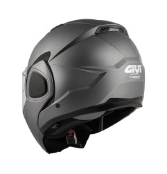 Il Givi X36 FIBER è un modulare ribaltabile: la mentoniera ruota dietro la testa, evitando l’effetto vela causato dalla mentoniera in alto nei modulari tradizionali.