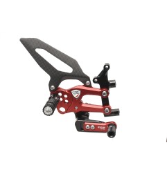 Realizzate in alluminio anodizzato con componenti racing, queste pedane sono sviluppate in collaborazione con team WorldSBK e British BSB. Offrono sezioni maggiorate nei punti di massima sollecitazione, doppia biella di rinvio per trasmissione senza flessioni, leva cambio su doppio cuscinetto a sfera e poggiapiede godronato per massimo grip anche in condizioni critiche. Paratacchi interamente in carbonio e foro per cavalletto da officina.