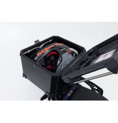 Il coperchio è completamente removibile e dispone di due limitatori di apertura. I punti di fissaggio esterni consentono di trasportare ulteriore bagaglio sopra il bauletto. Con una capacità di 38 litri, il top case può contenere un casco integrale o l’equipaggiamento necessario per un weekend o un viaggio più lungo.
