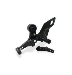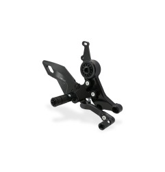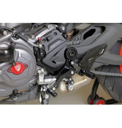 Realizzate interamente in alluminio ricavato dal pieno con lavorazione CNC e anodizzazione superficiale, queste pedane sono dedicate esclusivamente al pilota. Offrono otto combinazioni di regolazione grazie agli arretratori e ai poggiapiedi reclinabili e bloccabili. Le leve freno e cambio scorrono su doppi cuscinetti a sfera per una precisione superiore, con regolazione della lunghezza su guida di scorrimento. Configurazione cambio tradizionale o rovescio, con cablaggio per inversione impulso sensore Ducati QS incluso. Supporto per serbatoio olio e pompa freno posteriore, staffa scarico con silent-block.